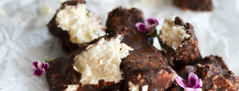 Nuorena pidin Bounty -patukoista, siksi kaikki lähti nyt liikkeelle Karita Tykän Hyvää huomenta -kirjasta, josta löytyi ohje luontaisesti makeutettuihin kookos-suklaapatukoihin. Kuten aina, minun on vaikea seurata valmista reseptiä. Siispä vähensin täytteestä hieman hunajan määrää ja lisäsin suolaa enemmän, tein myös suklaakuorrutteen tällä perusohjeella, koska Tykän kirjassa oli käytetty raakakaakaomassaa, mitä ei meiltä löydy kaapista. Korvasin myös vaniljauutteen ripauksella Bourbon -vaniljaa. Täytteeseen kannattaa myös mielestäni lisätä hitusen sulatettua kaakaovoita tai lisätä kookosöljyn määrää, jotta kookospatukat pysyvät helpommin kasassa kuorrutuksen aikana.