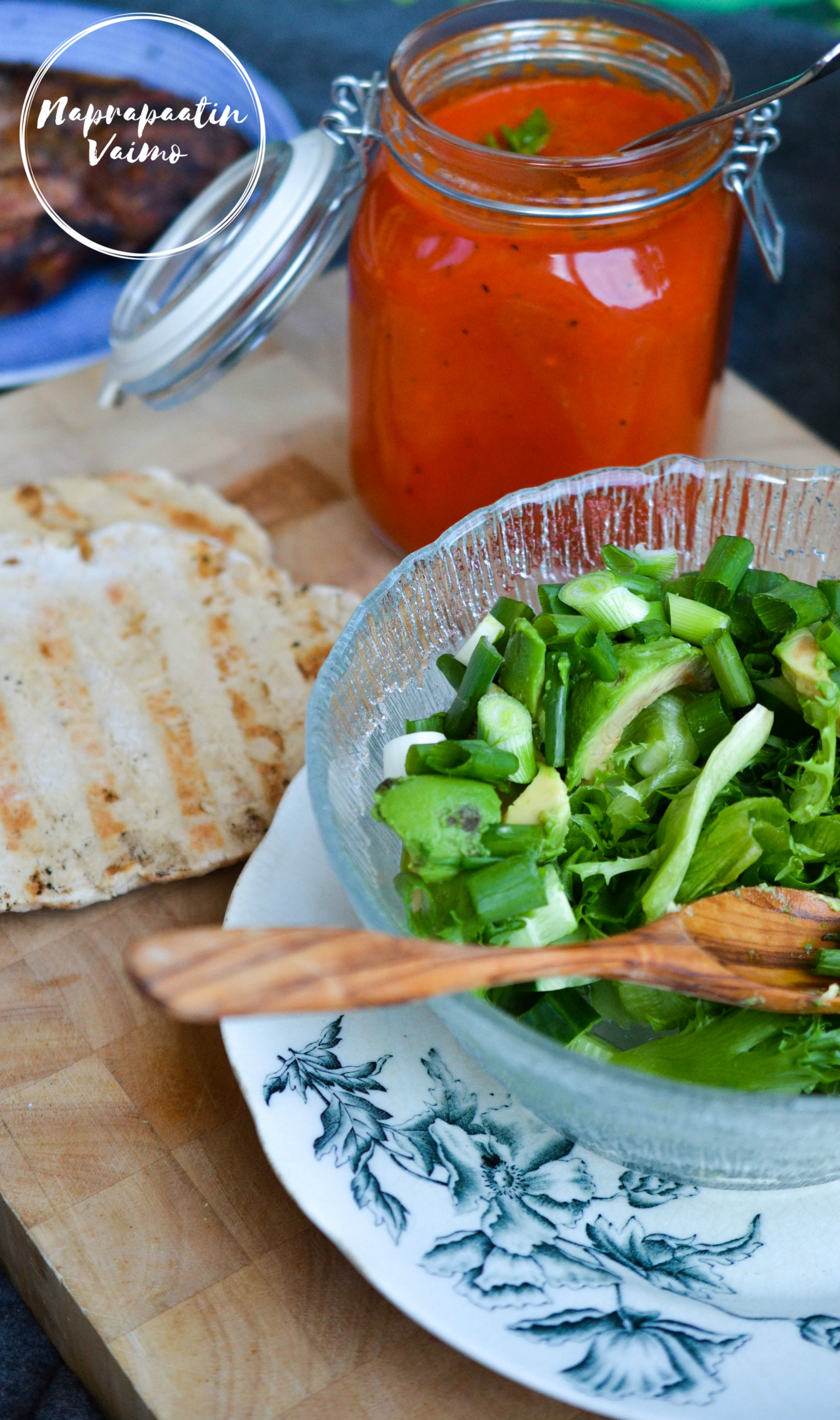 Tälle aterialle hiilihydraateiksi valikoituivat siis flatbreadit sekä maissi. Possua grillailtiin muun ruoan oheen. Ihastuimme tähän helppoon ruoanvalmistukseen ja seuraavalla kerralla flatbread sai kaverikseen vielä itse tehdyn ajvarin eli paprikarelishin. Jätimme tällä kertaa ajvarin ilman perinteistä munakoisoa, mutta yhtä hyvin voit paahtaa paprikoiden ohella munakoison ja käyttää sen sisuksen ajvariin. Herkkävatsaisen kannattaa kypsentää valkosipulin kynnet esimerkiksi paahtamalla yhden valkosipulin kokonaisena (kuorineen) grillissä/uunissa. Näin sen mausta tulee lempeämpi ja ajvariin voi käyttää vaikka kaikki kuoritut kynnet. Ajvar muuten hyytelöityy hieman jääkaapissa eli rakenteesta tulee lusikoitava, vaikka se lämpimänä olisikin enemmän kastikemainen.