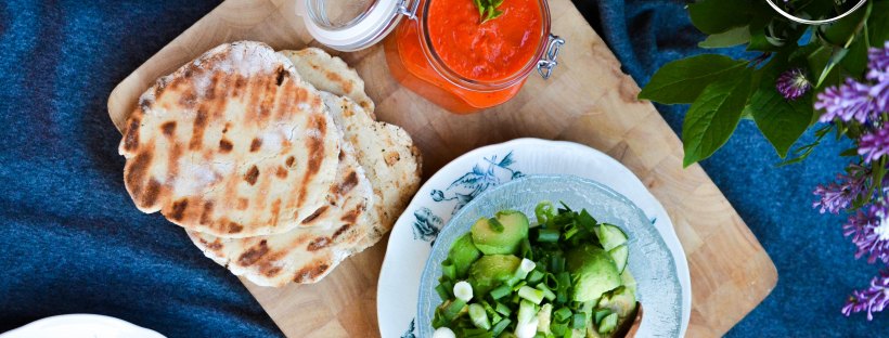 Meillä on muutenkin Weberin oston jälkeen keskitytty ruoanvalmistukseen ulkona, joten paprikoiden paahtaminen onnistui hyvin grillissä. Muun grillailun ohessa valmistuivat flatbredit, mutta toki ne voidaan kypsentää myös uunissa.