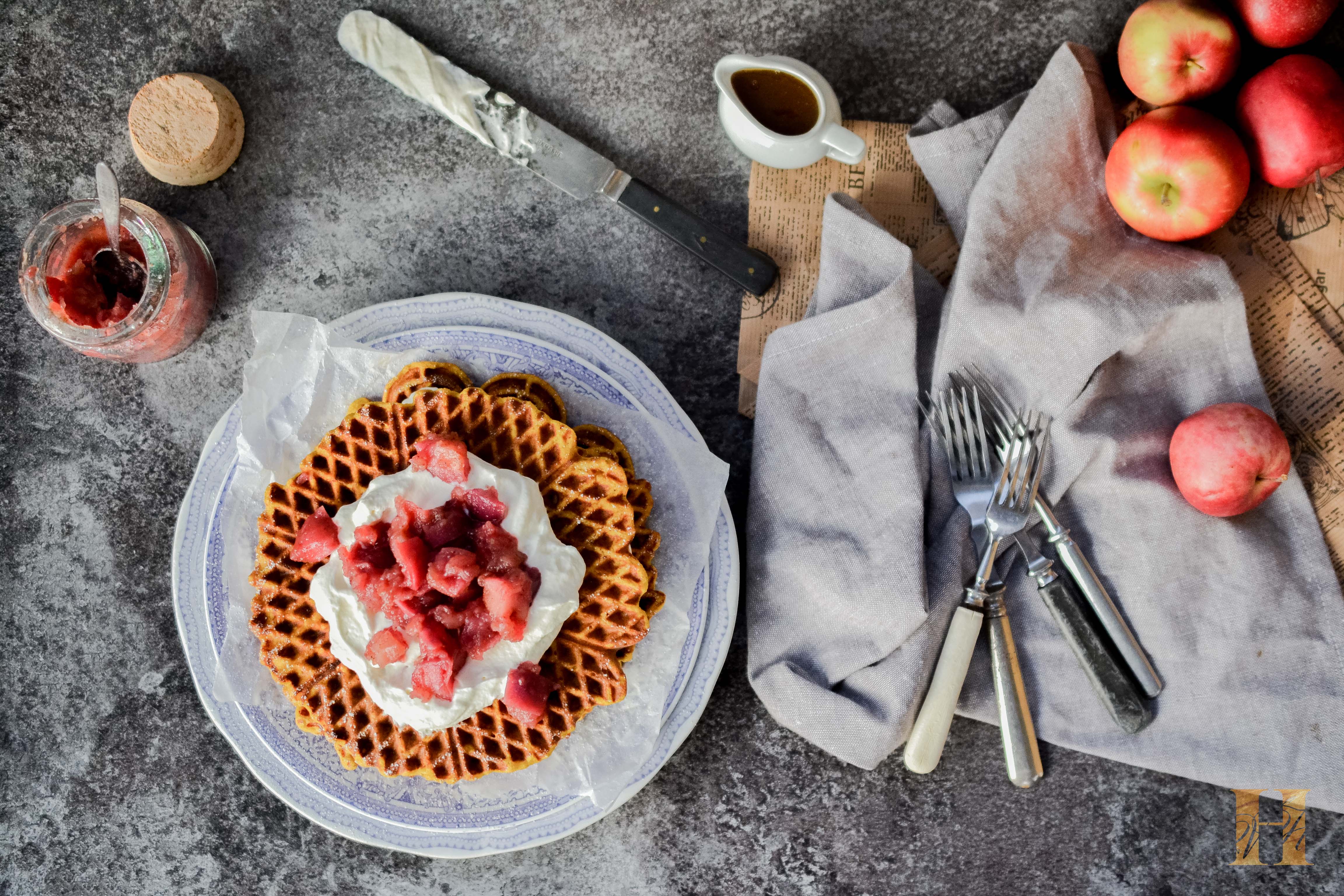 - Kokoa päälimmäisen vohvelin päälle kermavaahtoa ja loppu omenakompotista. Valuta pinnalle hieman omenakastiketta ja jätä loput jokaisen itse annosteltavaksi.