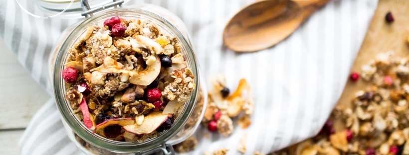 - Lisää jäähtyneen granolan joukkoon kuivatut marjat ja omenarenkaiden palat. Säilytä tiiviissä lasipurkissa huoneenlämmössä.
