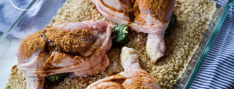 - Laske koipireidet riisien päälle ja ripottele lihan päälle suolaa sekä mausteseosta. Itse käytin Kuwaitista tuotua ”kanamausteseosta”, jossa on inkivääri-, valkosipuli-, paprika-, galanga- sekä kardemummajauhetta. Itse käytän mausteseosta aika reippaasti.