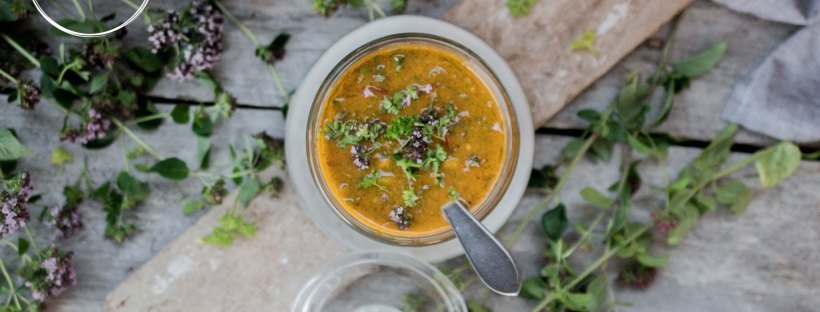 - Silppua sipulin vihreät varret/kevätsipulit pieniksi siivuiksi ja lisää kastikkeen joukkoon lusikalla sekoittaen. Koristele persiljasilpulla ja yrttien kukilla (kuvissa oreganon kukkia).