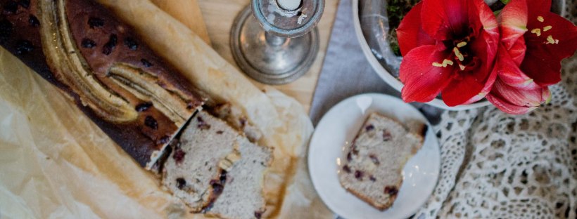 - Kaada leivinpaperilla vuorattuun vuokaan (itse käytin 28×10 leipävuokaa). Voit koristella leivän kuoritulla, pitkittäissuunnassa halkaistulla banaanilla, joka painetaan leivän pintaan sekä karpaloilla. Paista tasalämmössä 175°C:ssa n.60min, kunnes leipä on kypsä. Voit kokeilla leivän kypsyyttä painamalla hammastikulla leivän keskelle ja kun taikinaa ei enää tartu hammastikkuun, on leipä valmis. Jos leivän pinta tummuu liikaa, voit laskea lämpötilaa 150°C:n.