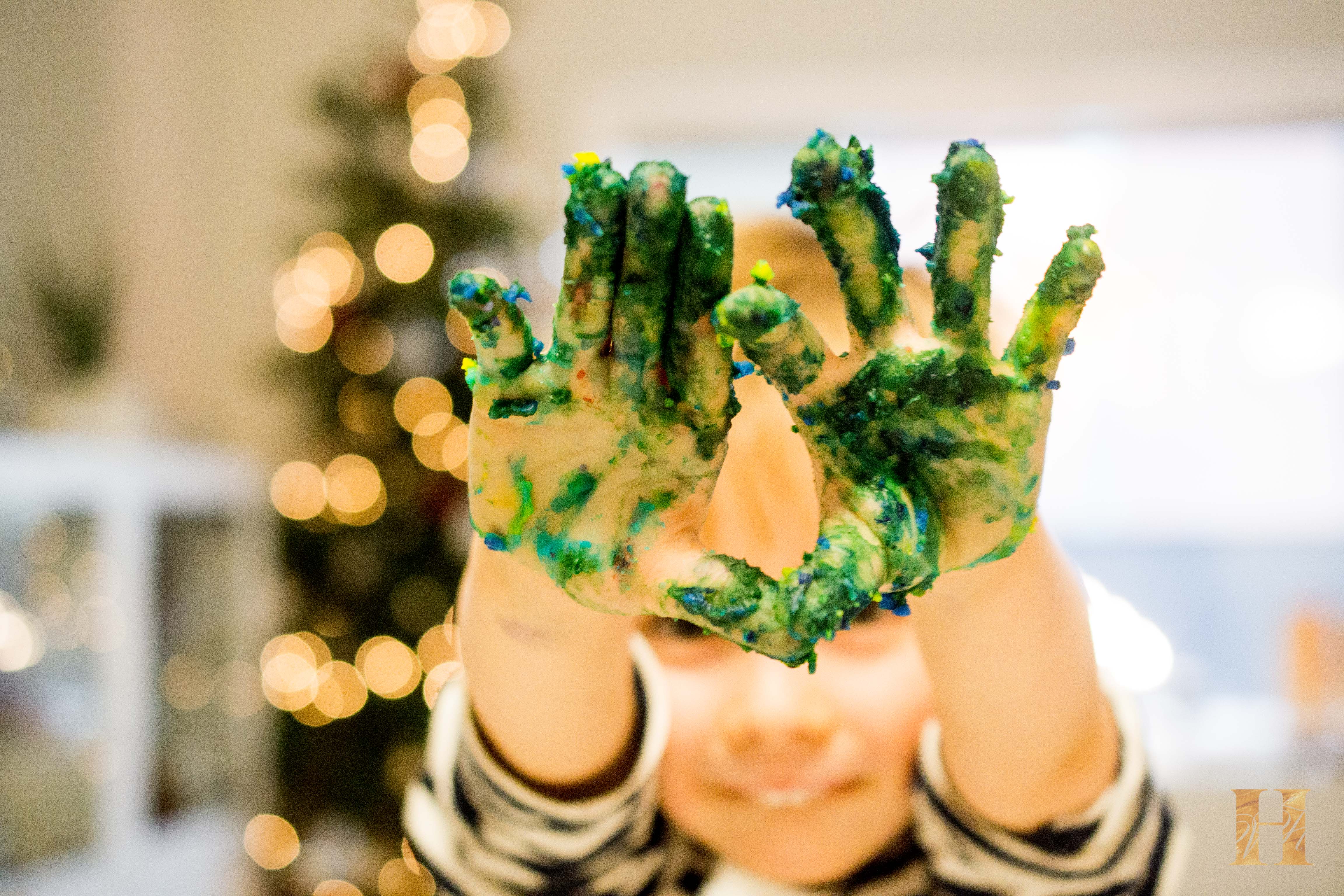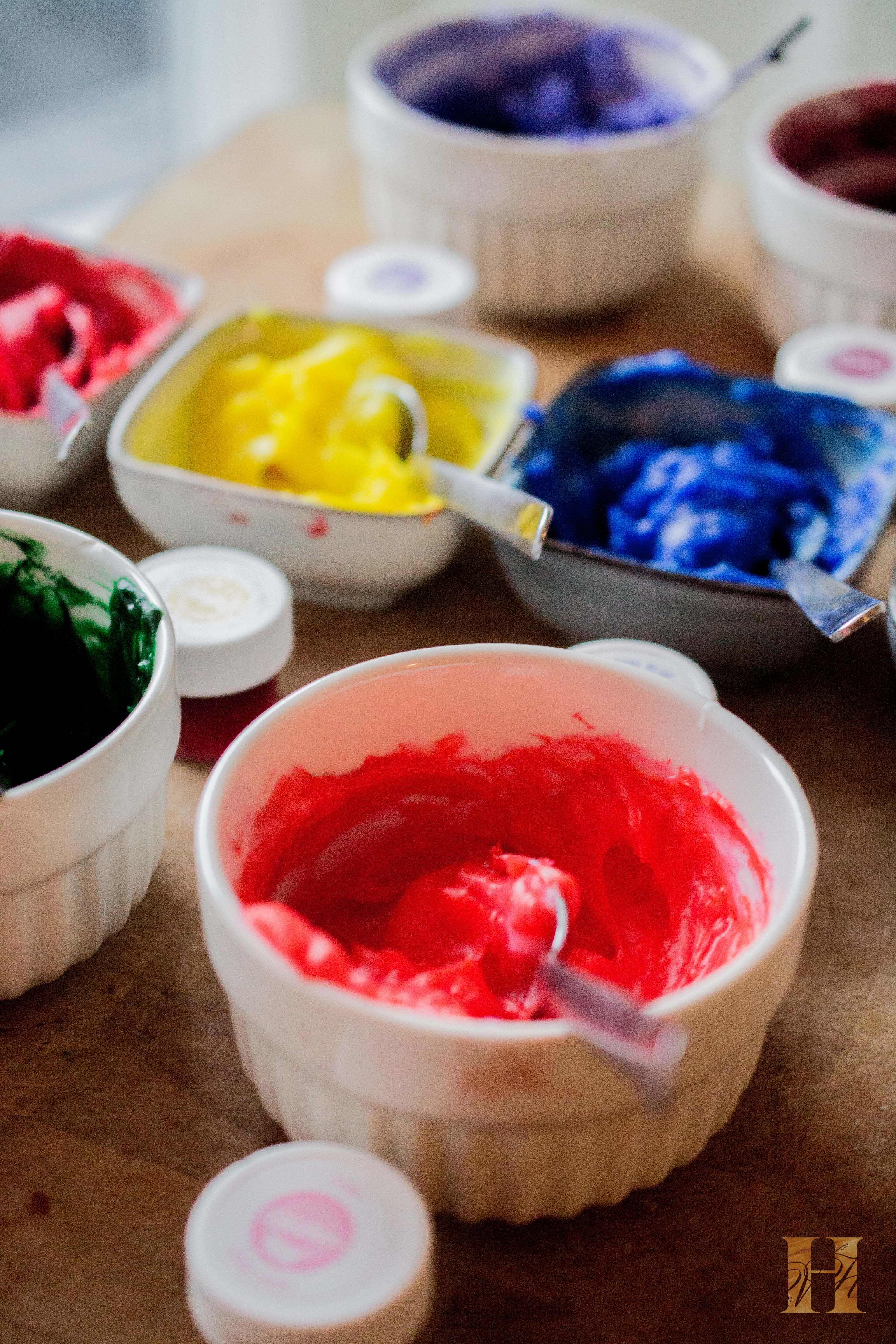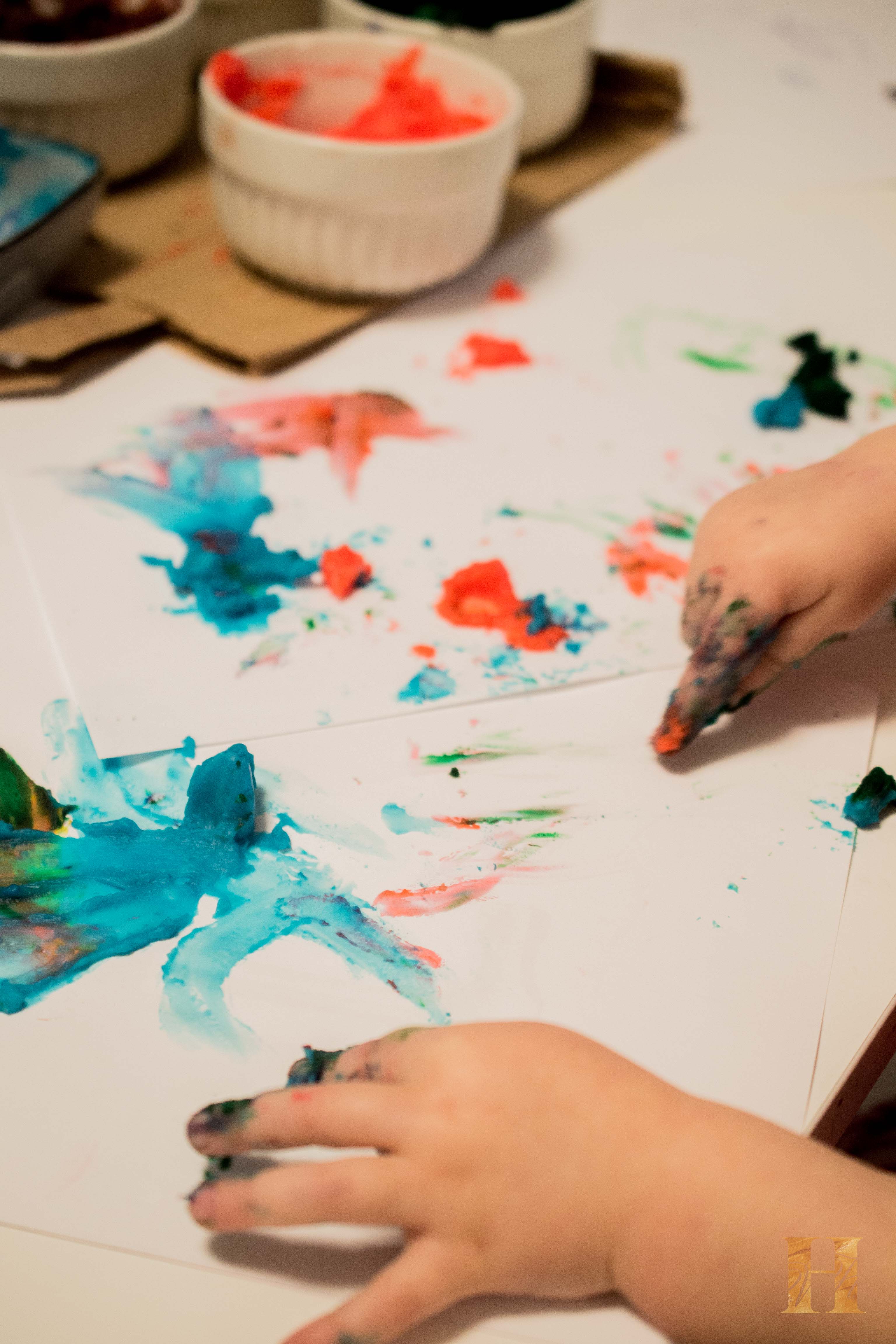 Väreillä oli hauska maalailla, joskin elintarvikevärien vuoksi niitäkään ei kannata syömällä syödä. Jos perheessä olisi vauva, käyttäisin värjäämisessä ruokaa.