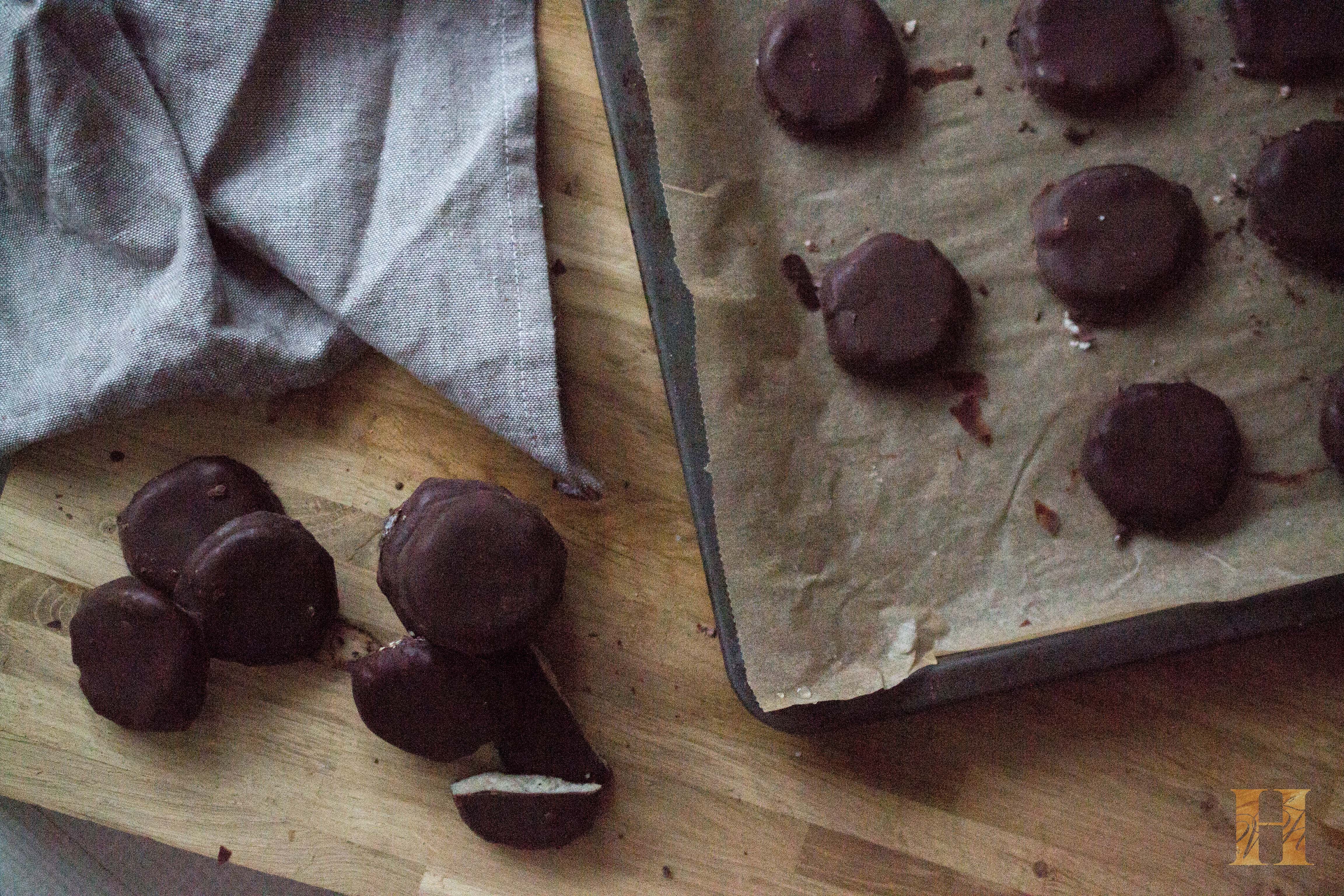 - Kasta jähmettyneet minttunapit kuorrutteeseen ja nosta takaisin leivinpaperin päälle. Jos omistat leivontaritilän, saat suklaakerrokset valumaan kauniimmin. Anna suklaan jähmettyä pinnalle jääkaapissa.