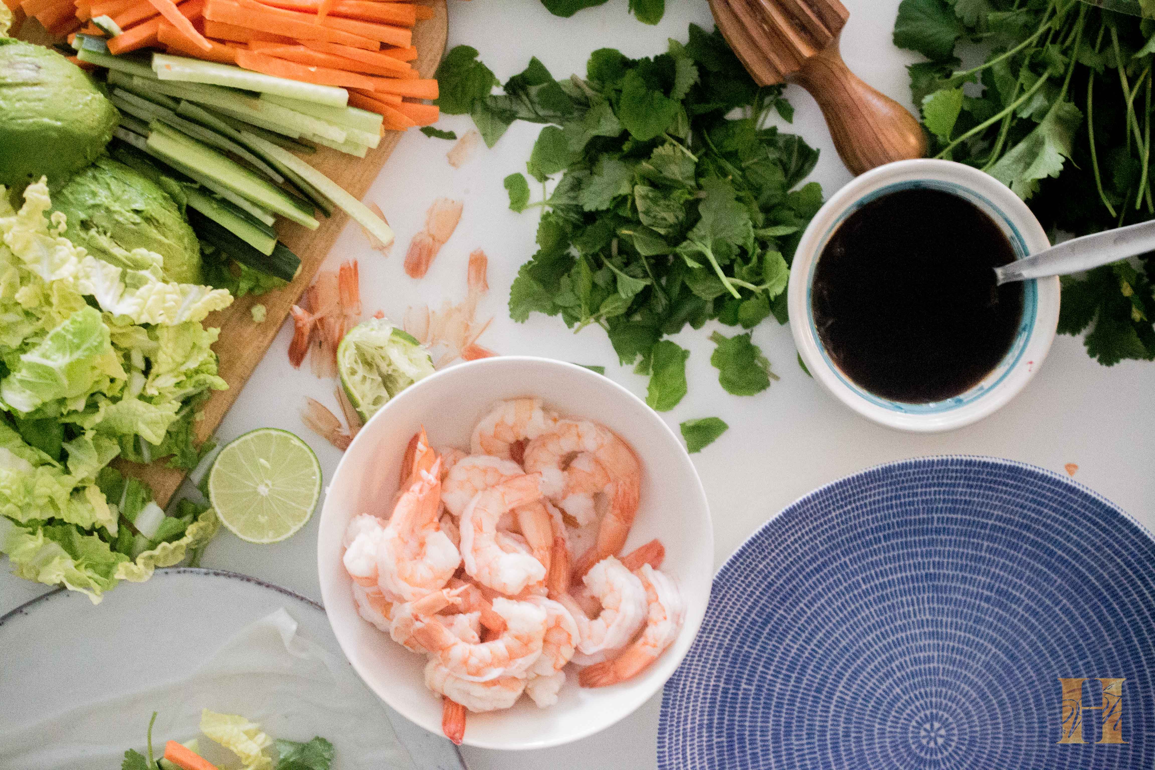 Valinta oli silti helppo, kaapista kun sattui löytymään riisipaperia ja pakastimesta jättikatkarapuja. Näin kesän kynnyksellä terassimme ja pieni pihamme täyttyy jälleen hyötykasveista, joten kaupasta ei tehnyt tiukkaa nakata kasaa yrttejä mukaan.