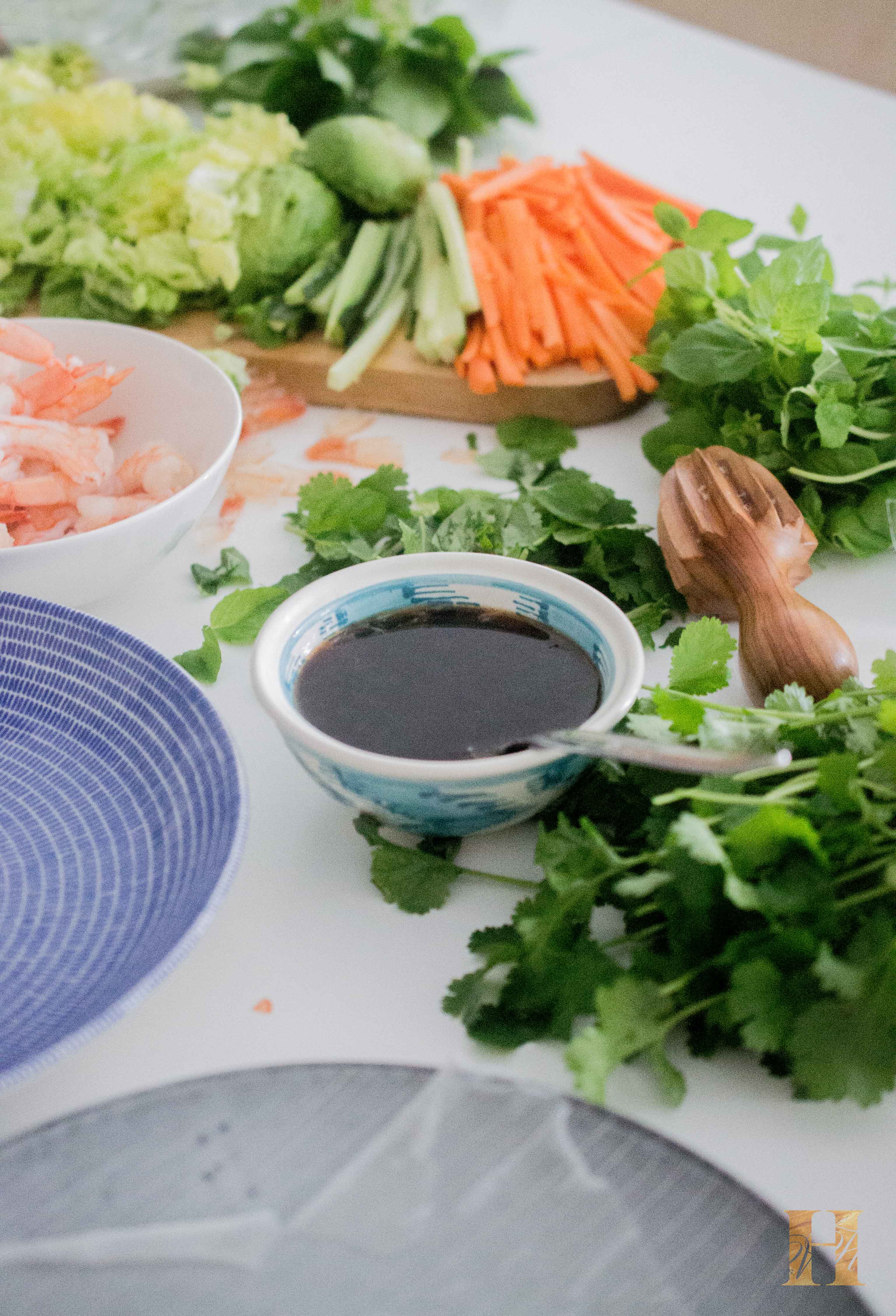 - Aseta riisipaperille täytteitä ja valele päälle dippikastiketta.