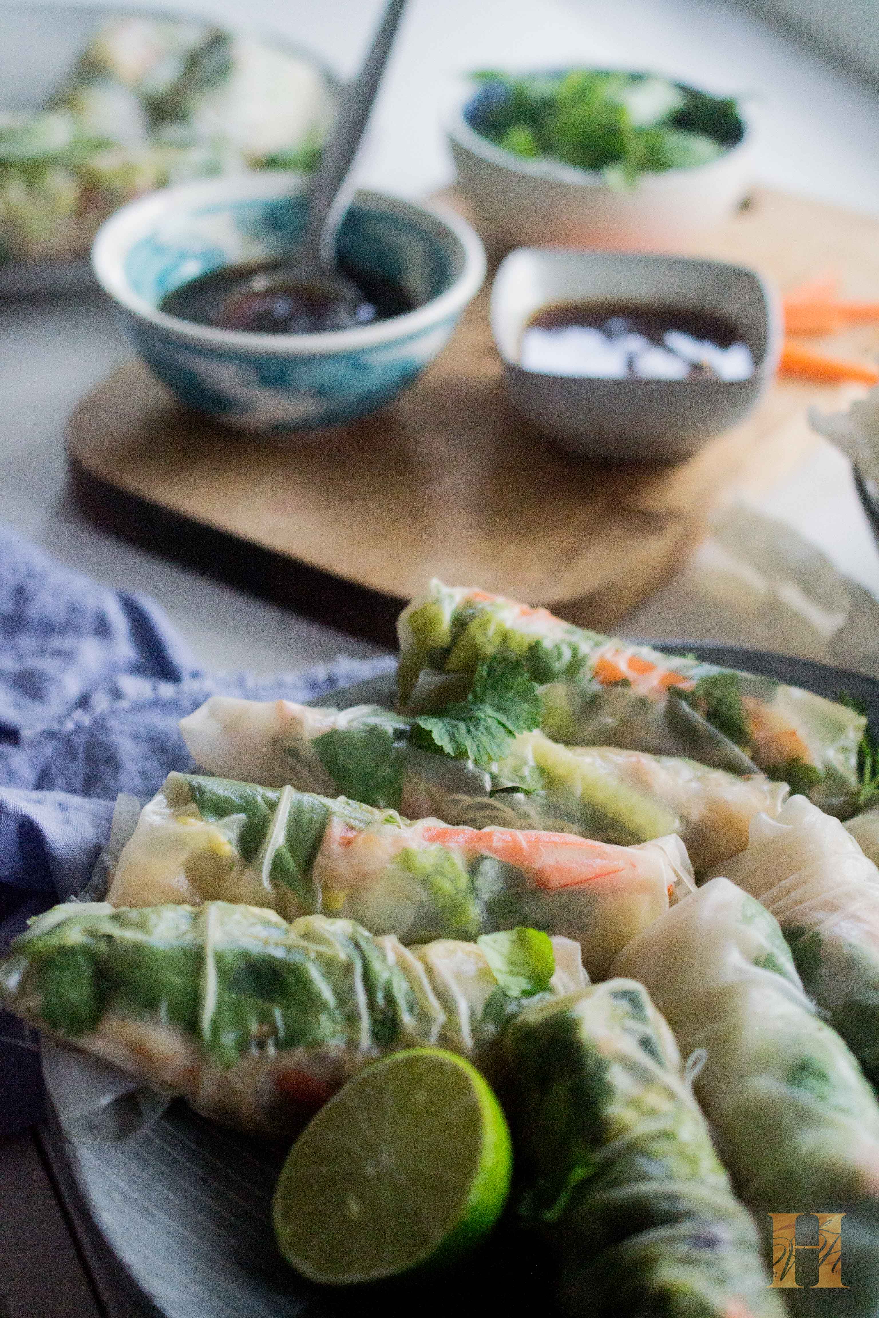 Näissä rullaaminen on se työläin vaihe ja riisipapereissa on isoja eroja. Itselläni aasialaisesta kaupasta ostetut olivatkin todella todella ohuita, joten kääriminen oli haastavaa pehmeän paperin repeillessä. Toisaalta maltti on (olisi ollut) valttia, sillä liian täyteen ahdetut rullat on myös jokseenkin haastavaa saada kokoon. Päivä pimeni jo kuvauksen näkökulmasta, mutta rullia kuitenkin saatiin aikaan ja herkkua tuli!