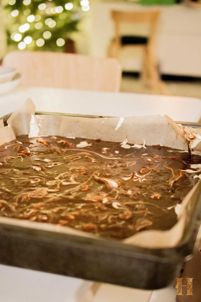 - Kaada reilu puolet suklaataikinasta vuoratulle pellille. Kaada tämän jälkeen mascarponetäyte päälle. Suklaataikina saa näkyä mascarponetäytteen alta eli kerrosta ei tarvitse sen ihmeellisemmin tasoittaa. Laita mascarponekerroksen päälle loput suklaataikinasta. Mascarponetäyte saa jälleen näkyä taikinan alta, jolloin leivoksiin muodostuu kauniita vaaleita marmorointeja. Voit myös halutessasi nostella lusikalla alla olevaa valkoista kerrosta ylöspäin. (kts. kuva alla)